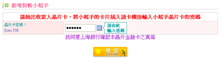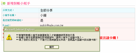 若您使用一代晶片金融卡讀卡機進行轉帳繳款或其他轉出交易時,系統會要求您先將卡片拔出,再於畫面顯示的倒數秒數內插回卡片才能繼續執行交易,以杜絕駭客遠端遙控。 |